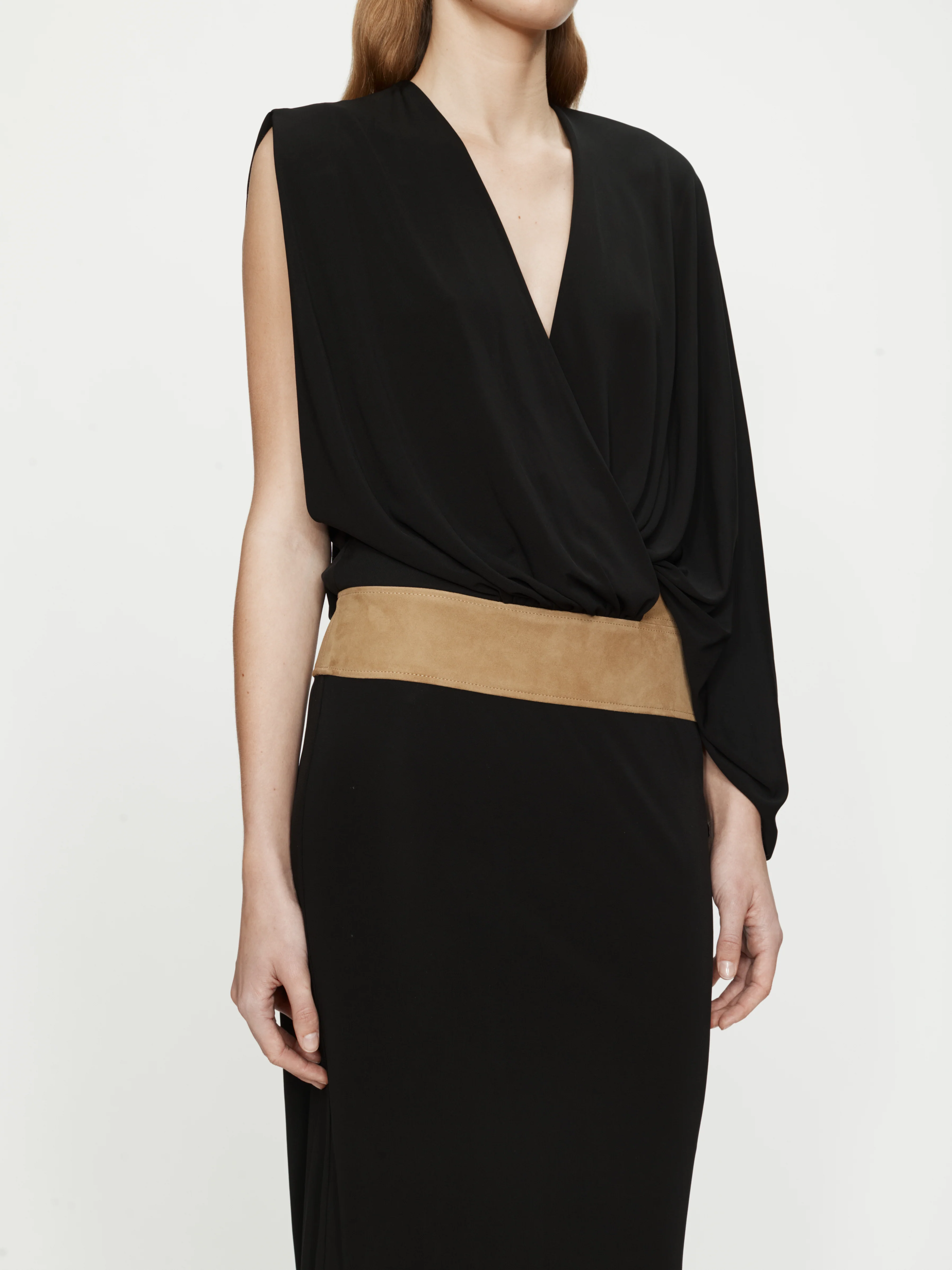 Draped with controlled ease, the Contour Suede Swaddled Dress is constructed from fluid jersey, gathered through the waist by a contoured suede band. A single-shoulder silhouette wraps softly around the body, balancing movement with structure.