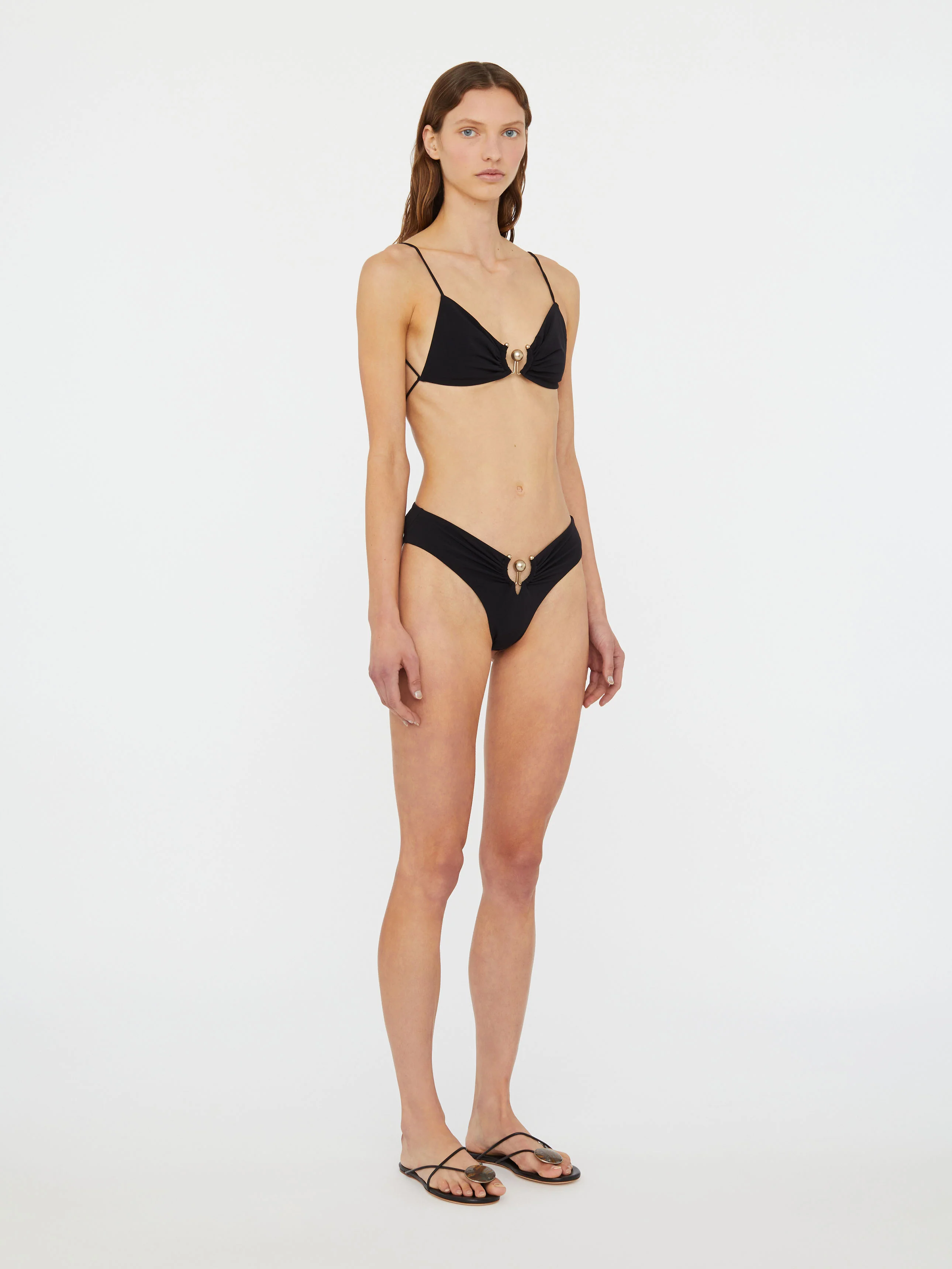 Sculptural orbit hardware pierces matte lycra for elevated poolside dressing. This minimal bikini top features fine elongated ties that adjust for ease of wear.