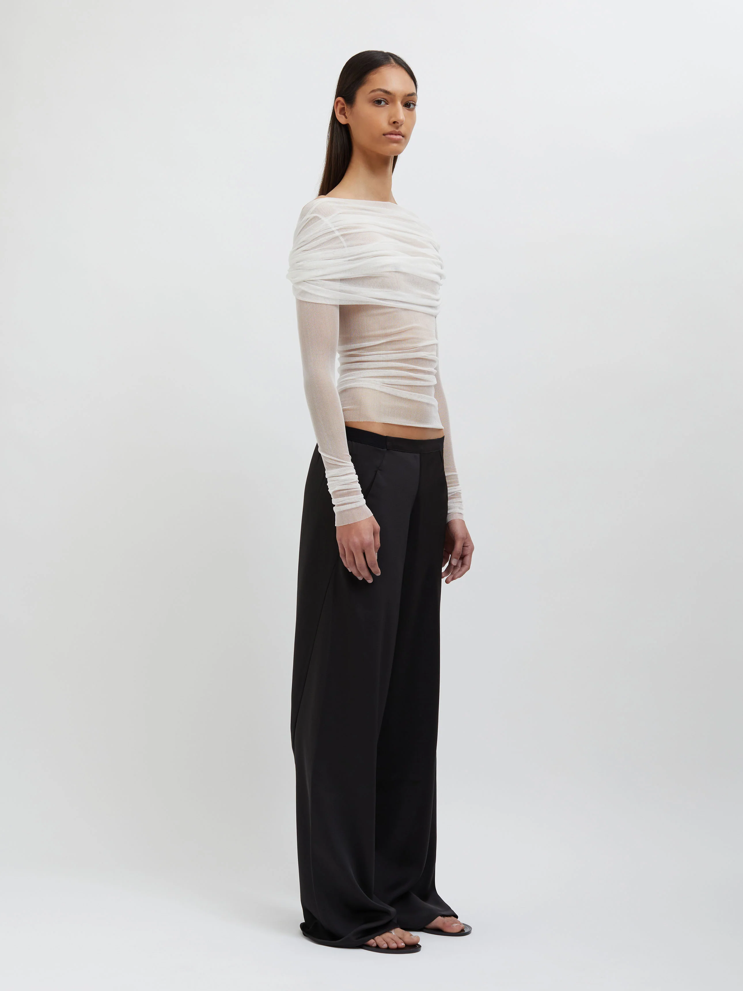 A signature Christopher Esber silhouette, the Veiled Top is worn off the shoulder and features a sheath of soft stretch silk tulle across the bust, which then offers transparency across the body.
